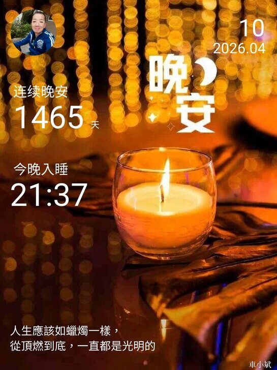 ⬆️晚安打卡圖,2026.04.10,人生應該如蠟燭一樣,從頂燃到底,一直都是光明的