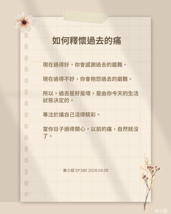 EP380 如何釋懷過去的痛 過去那件事到今天還痛不痛,其實不是由過去發生的事決定,而是由現在的心境決定。 例如,當一個人他今天過得好,功成名就了,他會感謝過去的磨難,因為他會認為幸好有那些磨難,才能...