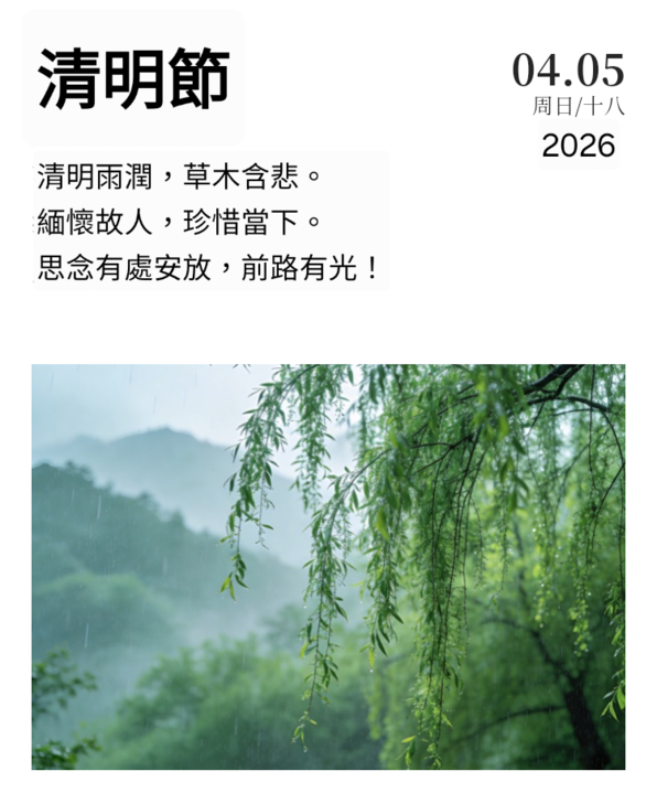 心語籤,清明節,2026.04.05 清明雨潤,草木含悲。 緬懷故人,珍惜當下。 思念有處安放,前路有光!