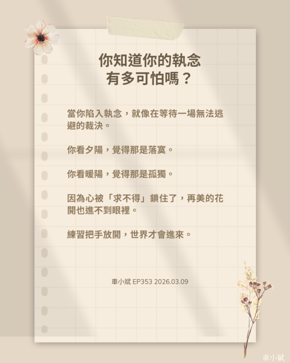 EP353 你知道你的執念有多可怕嗎? 執念,是人心最深的枷鎖。它讓我們看不見眼前的美好,只剩下痛苦的投影。 比如說,當你執著於「沒有對象」時,眼前風景再好也是諷刺。 有人因為愛情未到來而失落,有人因...
