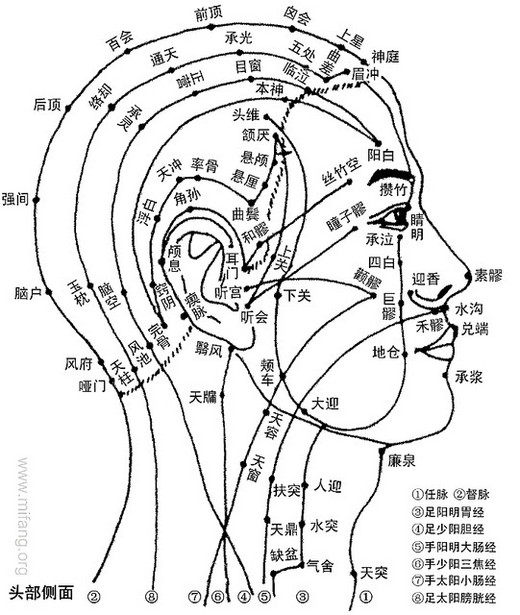 您看頭的側面全是膽經,有20多個穴位(參上圖),您都不用找,就這麼一梳,哪塊有點疼,就證明哪塊有阻塞,您就反覆地揉它,不知道那個穴叫什麼名字沒關係。