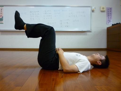 一、在抬腳時前、後需各喝300西西溫開水,心平氣和保持輕鬆,自然呼吸、不可憋氣,靠腰力及丹田氣力來支撐身體下半部所受之酸。使身體與大腿成九十度、大腿與小腿成九十度。支撐至少十五分鐘以上。