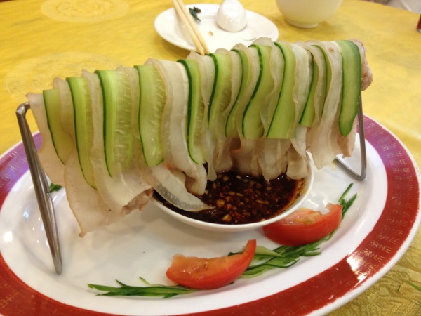 特別是這道成都曬肉據說是名菜,端上來用一個特製的鐵架乍看真像一個小型的曬衣架,上面曬著五花肉常片間隔夾放著黃瓜片吧,夾起來就是肉夾黃瓜片沾著特製的醬油酸醬,它的酸應該是檸檬汁,吃起來非常爽口有味,果然是名菜!
