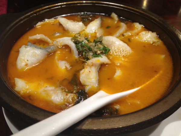 我點的主食是重慶酸菜魚,用的是鱸魚肚片煮的,這鱸魚肚片應該是用很新鮮的鱸魚肚片再快速川燙就起湯鍋吧,能把鱸魚肚片做的如此鮮嫰而有彈性,應該是我吃過最讚的魚片做法,真是可口啊!酸菜湯呢,我想就是油,濃,香,酸,辣!特別它的辣帶有尾勁,讓我在冬天直冒熱汗十分鐘!好吃到我捨不得一次吃完,把它打包回家!