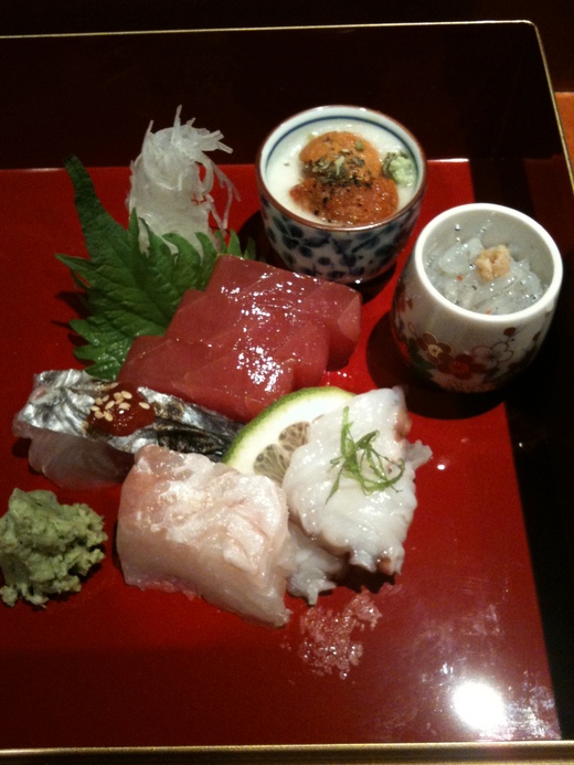 日本料理一定少不了生魚片, 由真是有咬勁的半生的花枝以及吻仔魚 半醃過的鮪魚組成的生魚片, 好吃.