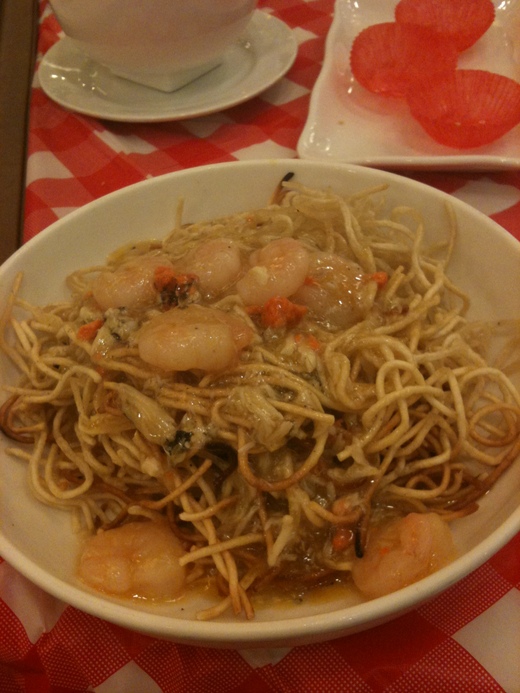蟹黃炒麵兩面黃,其實就像在飲茶館裡的廣州炒麵啦,但是我這個半個廣東老饕可是內行的喔,因為要做到兩面黃可不容易的;這個蟹黃炒麵兩面黃做得到是普通,油了點.
