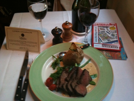據說這是由有百年歷史的老房子改裝而成的丹麥餐廳。每次來都必點”沙拉Bar”(聽說是哥本哈根首家提供沙拉Bar而知名的餐廳). 我點了喝多少算多少裝在有刻度瓶子的紅酒House red wine. 主餐呢,我還是點來自阿根廷牛肉的碳烤牛排。最後來一大壺沖泡的咖啡來舒解我極為滿足而緊撐的胃。