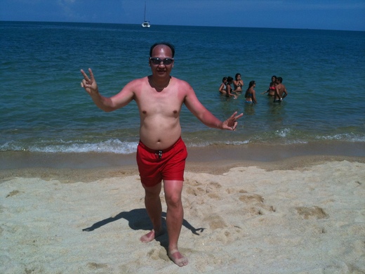 20日:今日520啊並慶祝馬英九就職周年, 累了兩天, 昨晚老婆就要求要睡到自然醒 --才是度假啊。起來時已經10:30,大吃大喝一頓後。這次努力地擦防曬油。老婆也在一旁檢驗. 我們透過飯店租了輛摩托車要300B, 但方便也不用押證件。12:30出發。加油(50+70)120B 。我們往南騎一陣 , 翻了一座丘陵 , 在一個不知名的路邊公園停下來拍照. 真的很美. 再騎約十分到第一個景點拉邁海灘Lamai Beach:(位於蘇梅島東南岸、 從查文開車大約也要15分鐘車程。雖然沙灘較查汶來的短些,但水深得多 , 沙灘更寬廣乾淨 , 也相對的較為恬靜安寧 , 是我們這次在蘇美四大海灘看到唯一比較符合預期的海灘 )