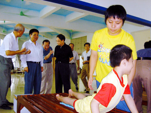 這天上午我們來到“殘疾康復中心”。車剛駛進中心大門,一群穿著鮮黃制服的小朋友,立刻鼓動著雙手,使勁地喊著“伯伯好” “阿姨好”!中心理事長迫不及待地告訴我們:「這35個都是接受你們資助的兒童,兩年前送來的時候,一個個又聾又啞,經過中心特殊訓練後,現在他們都能說出簡單的單字。」駐院的醫生也喜孜孜的表示:「聾啞兒童在七歲之前,若能接受訓練,都有“發聲”的機會,一旦超過七歲,就沒有治癒的機會了。」