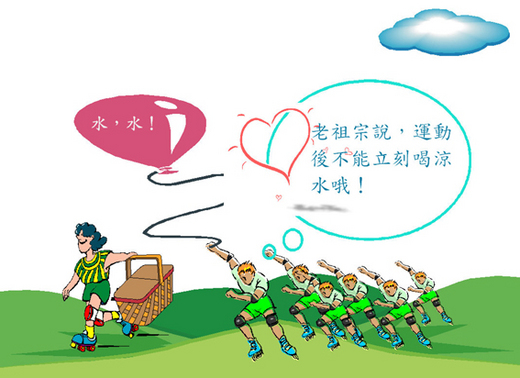 莊淑旂認為,運動員由於運動習慣,喝溫水應該無礙,不過,精神疲勞、身體疲勞,切忌在運動後、尚未和緩時,把一大杯的水灌下肚。