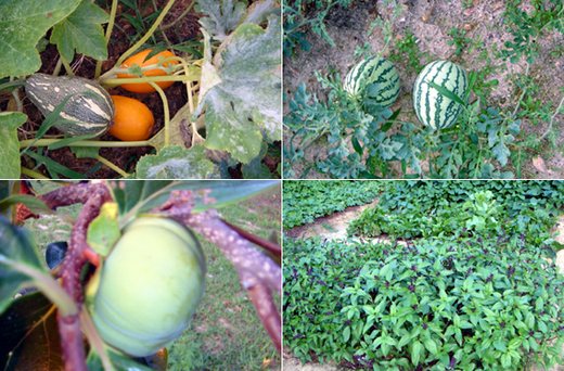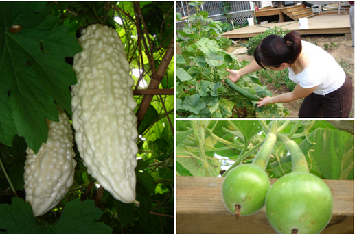 ↓第一次看到苦瓜出現在架上,那種興奮真是筆墨難以描述的;下為九層塔,柿子和西瓜,這些都是北卡生活的一部份~