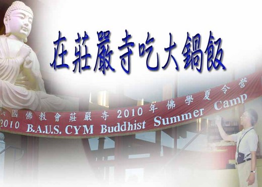 2010年莊嚴寺的佛學夏令營從七月一日開始,到五日中午圓滿,250人分成人、英文、少年和親子四組同時上課,今年的主題歌叫「慈悲與歡喜」,參加學員大部份來自美東各州,也有從美中的印地安納州,從加拿大的多倫多和蒙特樓,從佛羅里達州等地專程前來,寺裡邀請了台灣的淨照法師、明光法師、寬謙法師和果禪法師,及馬來西亞的開印法師和開照法師,五天四夜裡大家在這裡領受法義,洗戰鬥澡,吃大鍋飯,也許環境不像家中舒適,但大家如食甘飴。