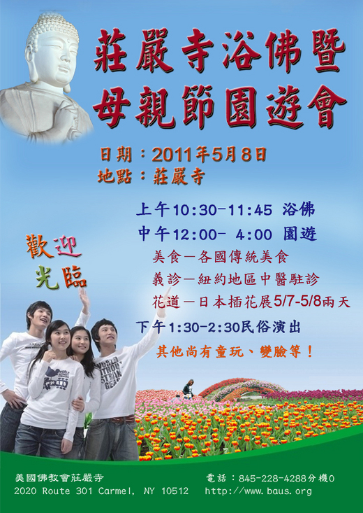 時間過得真快,轉眼又到春暖花開季節,今年紐約莊嚴寺的浴佛法會即將於五月八日星期日舉行,這天正好是母親節,這和很久很久以前末學辦園遊會的初衷一樣→向天下慈母表一表我們的心。