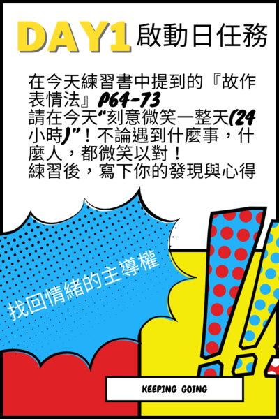 Day 1進行「刻意微笑」時,就是由我們啟動暗示機制,先讓他人認為「我們遇到什麼好事」,反過來暗示我們的大腦,製造『有好事發生』、『事情很順利』等等暗示循環。
