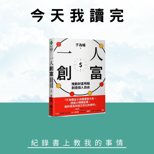 時間上的支配,你的工作能夠讓你發揮的自由程度是多少?你投資在身體上的訓練(或是運動)健康的財富又該怎麼衡量?人脈上的富有又是怎麼一回事呢?暢哥不藏私地用兩個章節的篇幅,來告訴我們要怎麼做,再來後面的感動是第五章背面的故事 ,(以下省略三千字以免爆雷XD),總之謝謝 #聚慧 舉辦分享會,讓我能夠有幸認識並且拜讀從一人公司到一人創富的過程,未來我會吸收並內化暢哥在書中所分享的觀點,分享給我的夥伴們,互相激勵並且學習,最重要的是去『實踐它!』 這本書推薦給大家