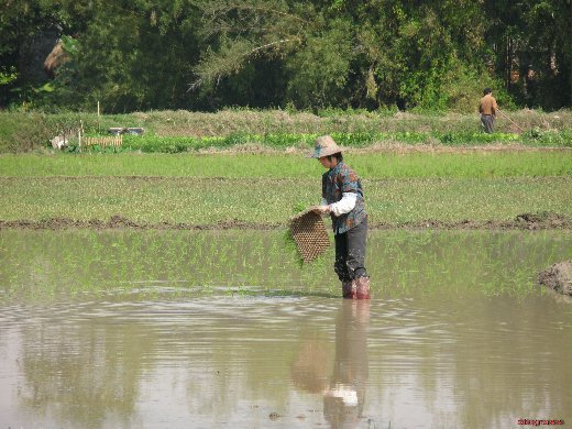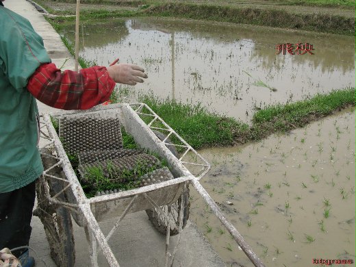 農耕機器幫忙翻土後,田裡充滿水份,待人們插秧。 遠遠見到農婦一面閒話家常,一面將青綠的禾苗像飛標一樣「飛插」於田間,非常準確地命中目標,不消兩個鐘,已將秧苗插得整整齊齊。 我們這班「外來人」,看到這麼好玩的東西,也讓著要農婦們給我們「插」;發現這方法可減少插秧時的背痛外,「飛插」原來也要訓練的,弄得不好,秧苗是只會往下沉而不浮上水面的! 我與朋友們來次大比試,嘻嘻,原來我有潛質當農婦,果真是百發百中,永不落空,好玩!