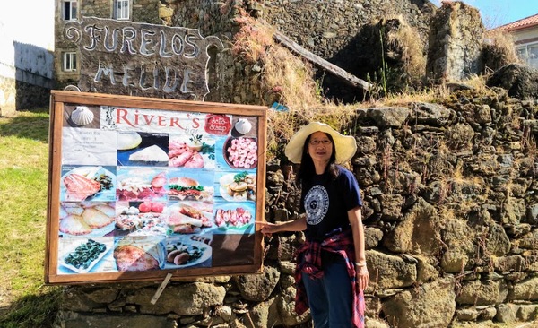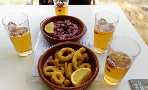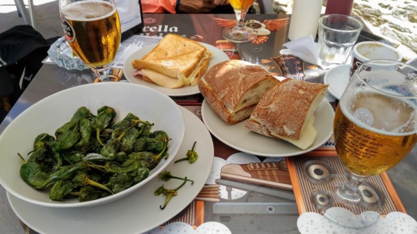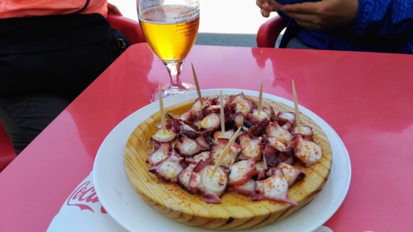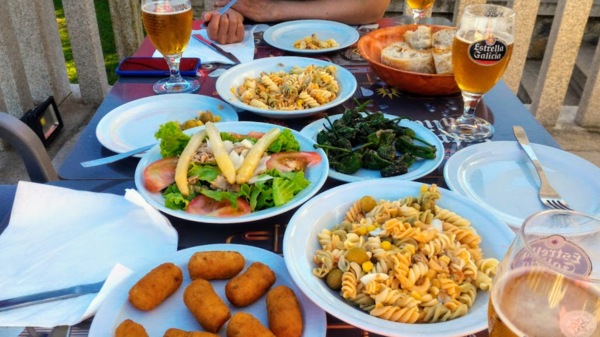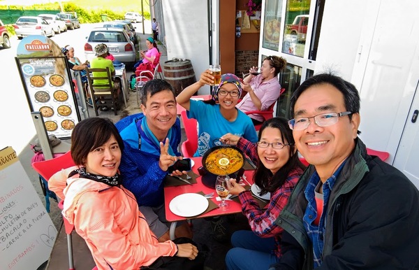 第二次休息的地方是在過橋後的河邊餐廳,品嚐西班牙小吃(Tapas)配冰啤酒。Tapas是西班牙開胃菜或小吃的統稱,各式各樣有幾十種,這一路上只要看到不一樣的Tapas,四人都會點來嚐嚐看。反正價錢除以四,都是很便宜,當時大吃大喝Tapas和冰啤酒的感覺,現在回想起來還很爽啊!
