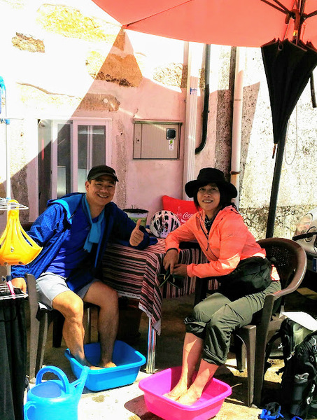 上午小艾走得輕鬆,一路上還可以跟頑皮的雲開玩笑;下午腳跟就愈來愈痛了,還好三點半就抵達青旅了。這家青旅在山坡上,視野遼闊,偌大的露台上,備有大陽傘讓客人休息看風景。四點以後,陽光不再炙熱,微風習習,翹高的雙腳也不痠痛了。居高眺望心曠神怡的美景,真正感受到健行運動後的美妙與滿足。若是全程都像今天這樣「半天健行,半天休閒」,行李托運、輕裝漫步;喜愛大自然的銀髮族應該都可以輕鬆達陣。