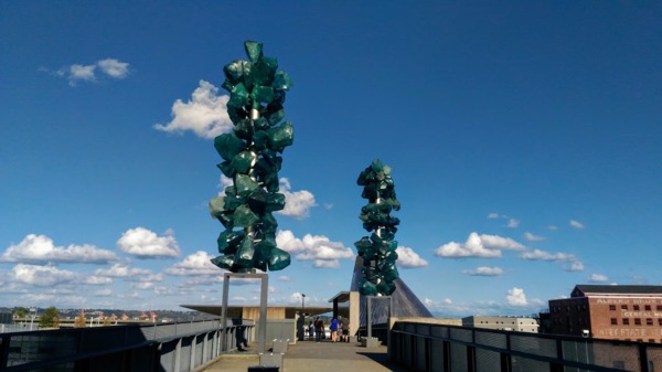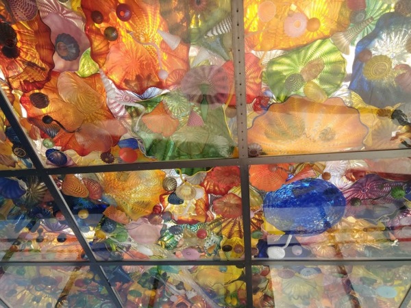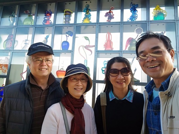 下午去參觀塔科馬玻璃博物館(Museum of Glass ,Tacoma),除了看展覽的玻璃藝術作品,還可在創作工場看現場製作玻璃藝術品的過程。看似單純的一只容器,手工製作過程卻相當繁複,要完成一件玻璃作品很不簡單呢!博物館的外圍與頂層都有大型的玻璃藝術品,尤其是奇胡利天橋(Chihuly Bridge)上的玻璃藝術創作,整體空間的設計與作品呈現,令人讚嘆。走上天橋,穿過繽紛的廊道,雖然不知作者的創作理念,但感受到作品的精妙,值得再三玩味。
