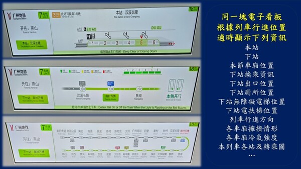 在環遊世界的時候,認為台北捷運不輸國際;這次在廣州和深圳搭捷運,感覺不輸台北捷運,捷運站體和車廂都整潔且運作良好,特別是車廂的電子看板資訊非常人性化,到站的電梯、洗手間、出口位置以及各車廂的擁擠程度、冷氣強度都會顯示。每輛捷運都有安檢人員巡視,但是,在乘車文化方面還有待加強,「先下後上」變成「一馬爭先」,車廂內吃東西也屢見不鮮。廣東捷運二元起跳,票價比台灣便宜。在深圳,65歲以上老人搭捷運免費,可直接走人工通道進站,這城市很大器啊!