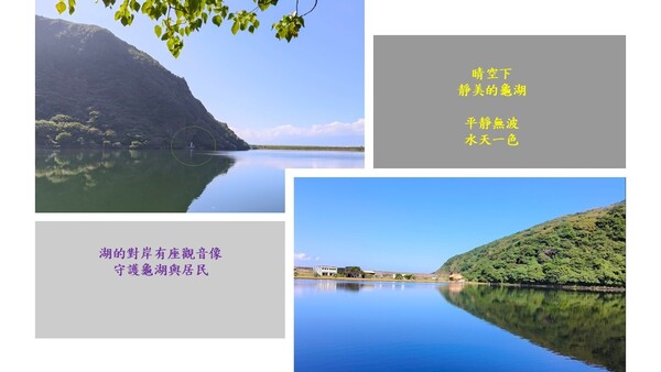 龜山島原先為軍事基地,現在是觀光景點,島上最美的風景在龜湖。龜湖原來是個淡水湖,後來島上居民引海水進湖,本希望成為一個漁港,但是每次築堤都被颱風吹垮而堵住,所以現在是鹹淡各半的湖泊。龜湖風光靜美,沿著環湖步道走一圈,可看到湖中魚群和許多烏龜;湖的對岸有一座觀音像,安詳守護著這座島嶼。