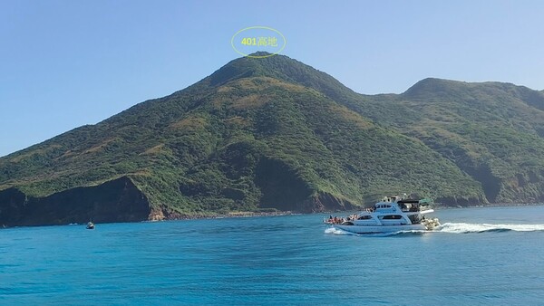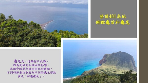 龜山島401高地是龜山島的最高點,其實龜山島的海拔只有398公尺,再加上3公尺高的頂端碉堡,才是「401高地」。雖然401高地步道全長只有1300公尺,但是卻有1706階,登頂需要一個多小時,保證汗流浹背,登頂的感覺就是暢快淋瀝。登頂俯瞰四周,山下的龜首、龜尾、遠處的蘭陽平原以及更遠的雪山和東北角。龜尾最特別,它是一道鵝卵石長灘。因為受風向和潮水的影響,尾端會隨著季風而南北向移動,不同時節來訪會看到不同的龜尾形狀,真是「神龜擺尾」。