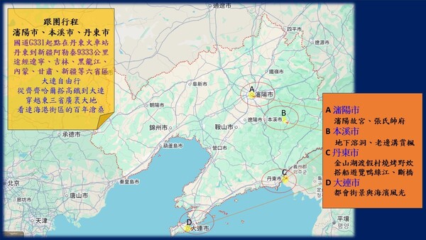 2025/10/07~31 瀋陽.大連.本溪.丹東.瀋陽故宮.張氏帥府.331國道 在遼寧省,我們探訪了瀋陽市的瀋陽故宮和張氏帥府,本溪的地下溶洞和老邊溝秋色,丹東的斷橋和鴨綠江風光,還有331國道的...