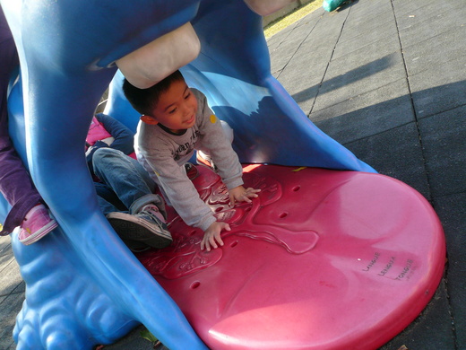 原來辰看中像日本台極限體能王溜滑梯旁的彎曲攀岩,一個沿著S型溜滑梯有大小不一洞孔的硬塑膠扶牆,就想爬看看挑戰自己的極限,一個漂亮可愛的小妹妹跑過來也要爬,媽咪叫辰先讓小妹妹,小妹妹馬上說她中班耶...媽咪笑笑說喔那辰跟小妹妹是同學囉...才剛說不到三秒鐘,旁邊又出現一個小男孩說他也是中班,然後三個小孩就排隊準備挑戰極限,無奈一一試過後每個人都在轉彎的地方怕怕返頭爬回原地...媽咪也忘記到底後來我一個大人跟三個小孩在扯些啥?