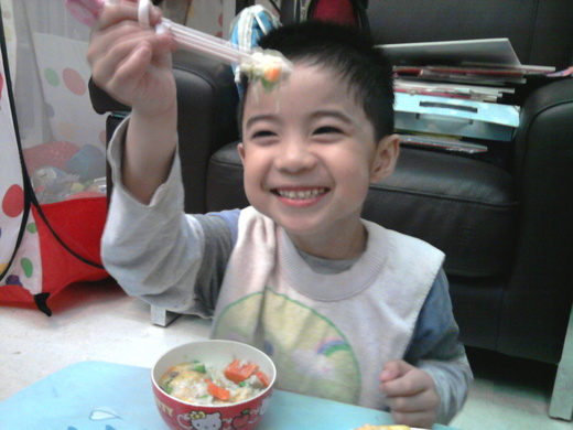 就這樣...媽咪從辰辰大約兩歲開始就奉命(應寶貝兒子的要求)製作內有紅蘿蔔、洋蔥、肉、青豆仁、小魚、綠色花椰菜、薑絲等食材的焗烤飯~直到現在辰都五歲七個月了,這小子竟然還願意等二十分鐘烤箱烘焙的時間...
