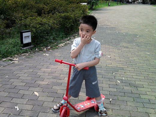 5/19下午還可愛地要求媽咪讓他帶滑板車去公園訓練腿力...誇張地是他竟然開始爬大石頭了...活力湧現...