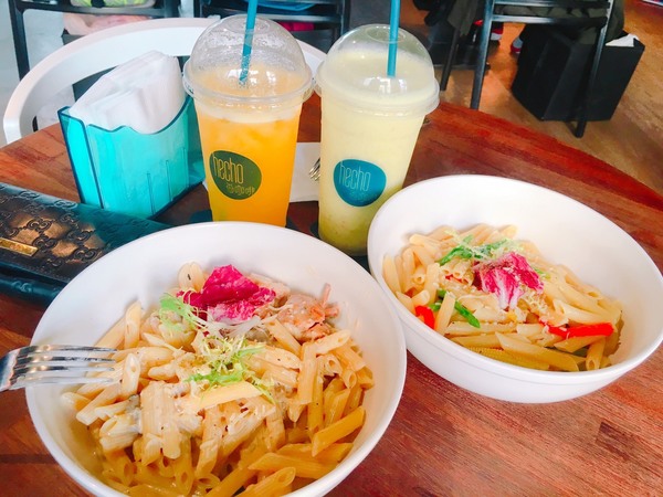 兔子與朋友點了起司野菇蔬菜麵、香濃奶油雞肉麵、香桃泡泡、綜合果汁