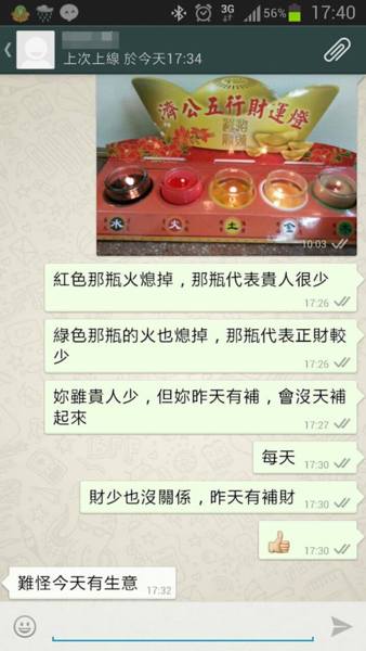 在點燈的過程中,木及火行兩個燈一直熄掉,表示正財及貴人運都不好及缺少。但點完五行燈的隔天,信眾的生意就變好了。