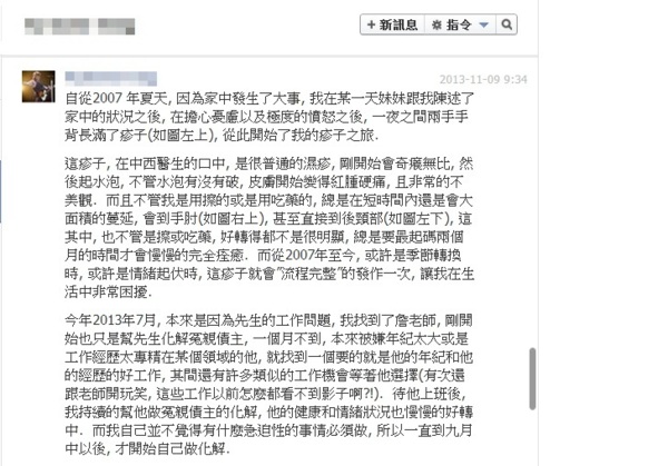 自從2007 年夏天, 因為家中發生了大事, 我在某一天妹妹跟我陳述了家中的狀況之後, 在擔心憂慮以及極度的憤怒之後, 一夜之間兩手手背長滿了疹子(如圖左上), 從此開始了我的疹子之旅.