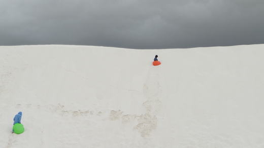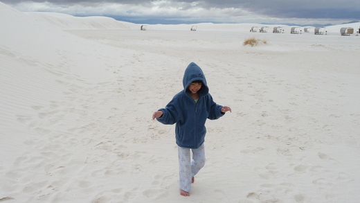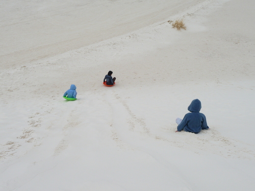 這是White Sands National Monument (New Mexico),在這兒漫天蓋地的一片白沙,但是這細緻的沙又不是真的沙,它們是石膏(gypsum)結晶風化,從附近一個乾涸的湖泊,被強風吹到這兒,形成一個又一個的沙丘。