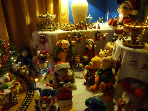 這老兄家中屋裡屋外,前院後院早就被各類聖誕飾品裝飾的熱鬧非凡,我想他只要每年把相同的收藏取出,擺設即可,可是這老兄卻是年年依舊添購新收藏。今年他家有了新的聖誕樹,多了一對聖誕布偶熊,一套迷你摩天輪。我開玩笑說:再過兩年來他家,就看不到牆壁了!(各位可到個人相簿看照片,雖然是去年拍的,但是今年和去年的雷同度甚高!)