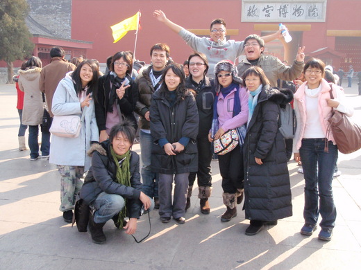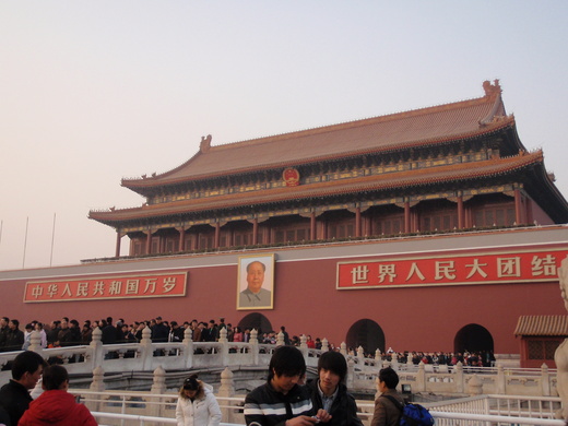 大家一直沿著紫禁城的中軸線走著,看著那落日餘暉灑在紫禁城的每個角落,從雲端後透出的陽光照著「太和殿」、「中和殿」、「保和殿」三大殿,好像老天爺調皮似的將金粉灑落人間,這景色真的是美極了,而我們一路上大家打打鬧鬧,照相的照相,感情真的很好,感覺到這邊大家都已打成一片了,出了「午門」,面對我們的就是那全世界最大的「天安門廣場」,據說可以容納整整一百萬人,真的非常壯觀,氣勢也非常驚人,在這裡台灣的「凱達格蘭大道」就顯的袖珍許多了!而這裡掛有「毛澤東」的巨型照片,他就是我們臺灣歷史課本提到的一位……非常非常「赫赫有名」的「毛主席」。