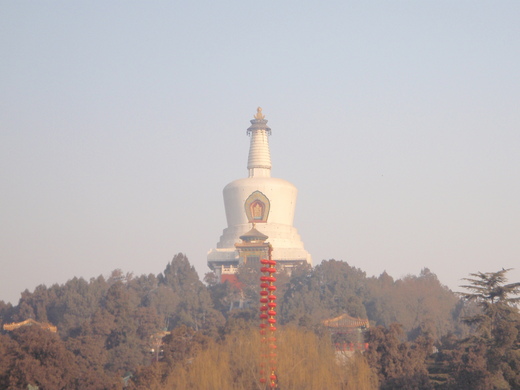 北海一直到明清兩代,都是皇家御苑,普通老百姓是看不到瓊島美景的。對清朝皇家來說,同樣來自少數民族的藏傳佛教,顯然比較合他們胃口。於是瓊島山頂上豎起了「藏式白塔」。修葺一新的雪白塔身在萬綠叢的最高處特別顯眼,從山上向下看,一池白霜在冷冽的寒風中顯的更加動人。不過,現在這邊大部分都是給北京老人家練功、跳舞的地方,我想如果再加上一點「那卡西」的聲音,就很像台灣早晨的公園了,真羨慕這邊的國家領導和民眾可以在景致如此迷人的地方辦公、活動筋骨。而北海公園裡面真的很大,依湖而建的各種景觀建築都極其別緻,不愧為一座皇家御苑,但因為時間真的太匆忙,大都只能走馬看花,照照相就得離開,真的非常可惜。