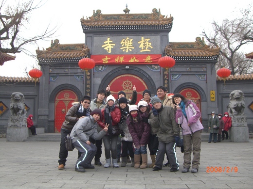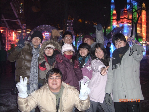 經過跟各位學弟妹一個晚上的折騰之後,列車終於在大約8點多的時候抵達我這次行程中最期待的冰城-哈爾濱,前一天晚上,手機捎來簡訊,哈爾濱大約是零下10度到13度,對東北人來說並不是算太冷的天氣,但是,對我們這群來自南方的台灣大學生,卻是一種可怕的嚴寒,我們早已將任何可以穿上的衣服都給穿上了,大家匆忙地出了車站,第一次走在哈爾濱街上,跟我腦中的想像,真的有一點落差,這一天路上完全沒有任何的積雪,倒是有不少噁心的痰,弄得我們團員拖行李箱時都小心翼翼的,深怕不小心就給黏上了,遠望整個城市,一片灰灰舊舊的大樓公寓,搭配著陰陰暗暗的天氣,感覺整座城市不太有朝氣,在這邊也開始覺得北京真的改變很多,北京市現在似乎看不到有那麼多人隨地吐痰了,只能說一個奧運真的能改變一個民族的衛生習慣。我們的落腳處是「果戈裏賓館」,這賓館旁邊有一座非常漂亮的小教堂,尤其是晚上,在週遭的各色的燈光襯托下,更是顯得光彩奪目,繽紛耀人。