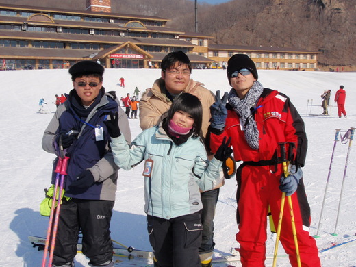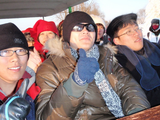 在這邊也偶遇了同樣來自台灣的青年團體,是台聯團的大學生冬令營,不知怎麼的,大家雖然都不認識,卻沒有一點點的陌生感,反倒有點像是久未謀面的好朋友,大家興奮的用自己的家鄉話台語打招呼,不過,可能我太融入這邊的環境了吧!他們竟然以為我是大陸人,因為我的國語似乎不再帶有濃濃的台灣味,反倒是有點大陸的捲舌腔。在這裡也是我第一次看到雪地裡的夕陽,雪地裡的夕陽不像台灣見到的夕陽總是藏在重巒疊翠的山嶺中,不然就是在掛在一望無際的蔚藍海面上,這裡,夕陽的紅色照在潔白的雪地上,感覺像是造物主刻意將紅色、橘色、金色的染料灑在單調的白雪上,來為它增加些許不同裝扮。我們就在夕陽的伴隨下步出這座美麗的風景區,出發前往另一個目的地。