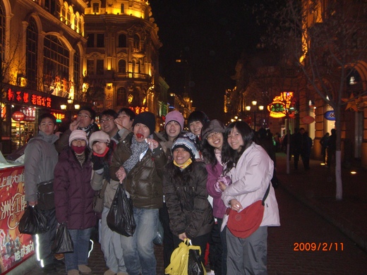 晚上,是我們台灣人最愛的「血拼時間」(shopping time),而戰場就是哈爾濱的「中央大街」,中央大街初建於1898年,剛開始是稱"中國大街"。1925年才改為"中央大街",後發展成為哈爾濱市最為繁華的商業街,沿襲至今。全街融入了各種建築風格的歐式及仿歐式建築,被讚譽為「哈爾濱第一街」,當然這裡的街道上也匯集了全中國最靚的東北俏妞,看的我們這群台灣男孩臉紅心跳。而我們一行人,像是蝗蟲過境般的將這邊每間店的俄羅斯巧克力、手工鏡、俄羅斯娃娃大肆搜刮一空,彥霖學弟更是兇狠,光是買各種巧克力,就可以買到兩間店才夠買,不過,有著潔白肌膚、瓜子臉、大眼睛的東北姑娘,她們也有著相當有名的火爆脾氣,一聽到我們殺價,一股火就從內心噴發出來,直接對我們下逐客令,真是嚇人,我想我們台灣人就是愛殺價,不殺價的決不是台灣人,而且有討價還價的過程不是也比較有趣嗎?在中央大街上,我們吃這邊有名的「馬迭爾冰棍」、俄羅斯巧克力以及瑪蒂爾麵包,真的很有俄國風情。而小叮噹在這邊也在這邊用心機、耍手段的騙走我一個俄式手工鏡,這事大家應該都已經知道了,我在這就不多說了。
