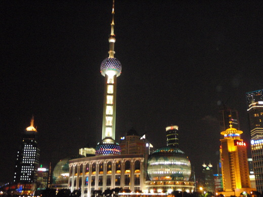 逛完了上海外灘與南京路,疲憊的我們終於吃了一頓好料,也終於讓我嘗到了真正的上海菜,不過,跟台菜比起來還是有點油,而且說真的,還是台灣菜比較好吃。吃完飯後,本團即再度驅車前往上海外灘,不過這次是要搭遊船在黃浦江上欣賞江畔的夜景,在這邊等了整整一個多小時,真的很久,不過看著一艘艘華麗的遊船進港,我相信這一切的都是值得的,登船後,守秩序的我們「果然」沒有任何的好位置,只好一群人站在船後的甲板伴著引擎聲靜靜的來欣賞這黃浦江的夜景,夜晚的黃浦江比傍晚看到的更加漂亮,下午看到的那些著名地標大樓,似乎很有默契的亮起了燈,互相輝映照耀著,似乎在比較看誰的燈光比較耀眼、比較能吸引船上的遊客與他們手中的照相機,坐在船上的我,看著夜景,很難相信有這麼美的夜景,台灣的淡水-八里海岸雖然也很美,但真的很難與這的夜景相比擬。