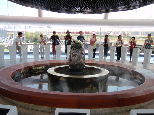 進入台灣館裡,蔡依林唱的主題曲不斷的演奏著,四周擺放著都是台灣的名人,很有回到家鄉的感覺,來自台灣的館長親自接待我們,還為我們選了最正的導覽員-皮皮,來自台中的皮皮真的很正、很可愛,甜美的笑容與聲音,真沒給我們出產美女的寶島台灣丟臉,我想這就是「外貿協會」應該有的辦事態度。至於她的一些資料嘛……學長我回台後都查到了,學弟們有需要記得M我一下喔!在她的導覽下,我們看了一段介紹台灣的短片,進入五樓的展館內,是整片環繞在頭頂上的「全天域螢幕」,這是一個720度的球形螢幕,短短的幾分鐘影片,簡單卻又清楚的將台灣的一切介紹出來,影片播放過程中,是藉著4D方式呈現,也就是讓你除了視覺和聽覺外,加上可聞到花香的嗅覺和觸碰到水氣與陣陣微風的觸覺,真的很先進也很有創意。離開全天域劇場以後,我們前往二樓的「點燈水台」,這水台蓋的真的很漂亮,水台正中間擺放的是著名的玫瑰石「洄瀾山水」,旁邊圍著清澈的流水,這潺潺流過的水皆是來自太平洋與日月潭的水,這點燈水台似乎也幫我們隔絕了外頭的炙熱暑氣,讓人瞬間涼爽了不少,待在這裡真的很不想離開。接著就是點燈的儀式了,站在點燈台前,看著螢幕上的所有標語,我覺得都太普通了,感覺不夠特別,其實我內心的願望是……交個像導覽員皮皮這樣正的女友。點完燈後,接著往一樓的「城市廣場」前進,裡面展示了台灣人民生活的點點滴滴,聽著台灣傳統民謠,喝著台灣著名的高山茶,欣賞著沏茶老師的泡茶手藝,真的很像回到我們的家--台灣。在這邊真的很佩服台灣人的創意,用最先進的科技將傳統與現代融合起來,也將台灣的風土民情與好山好水全都濃縮在這台灣館裡,難怪會被許多國際媒體評選為最值得參觀的展館第一名,這……可不是隔壁那棟紅色的大館可以比的喔!