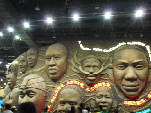逛完了被茫茫人海包圍的歐洲館區後,就出發往唯一一個每個人皆可輕鬆進入的「非洲聯合館」了,這是上海世博會11座聯合館中規模最大的展館,也是歷屆非洲館中參展國家最多、建設規模最大的非洲館,非聯館的外牆四面有著不同的圖案,有漫步在非洲大草原的各種動物、有行走中的駱駝隊、有翱翔的海鷗和帆船,還有城市和鄉村的輪廓,「這些圖案應該是代表著非洲的不同地貌特徵吧!」我心裡是這樣的想著。這一次總共有42個國家和國際組織非盟搬進了此館,在裡面,我的組員們全都失散各奔東西了,我只好一個人在裡面到處亂轉,不過,「非聯館」並沒有想像中的簡陋,相反的,我覺得每一個館都清楚地介紹了自己國家的特色,逛著各非洲國家的展區時,有不少的非洲朋友給了我這觀光客小禮物,並且微笑的跟我合影,很能感受到這些非洲朋友的熱情,館的正中央有一面牆上面刻著各種非洲人的臉孔,表情很豐富多樣,而這也是我最愛的一個景點。就在這非聯館裡逛著,也殺了我不少時間和照片,不過,還挺有收穫的。