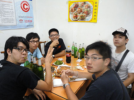 出發前往附近的燒烤店,還記得04年來的時候,吃過一次這邊的燒烤,感覺真是賺到了,這邊的烤羊肉串挺地道的,而且真的不貴,吃再多荷包都不會感到損傷。這次是跟李立波大哥去吃一家他熟悉的燒烤店,順便喝著這邊的啤酒,烤羊肉串真的很好吃,我早已不知吃了幾串,而李大哥還特地把我叫了出去喝了一杯特大杯的啤酒,酒是很好喝,但喝超過就不好喝了,總感覺胃不斷的翻騰著,好像有一種快爆炸的感覺。燒烤店老闆的女兒也是個奇女子,居然對我們這些大哥哥說:「我這人比較不喜歡喝一口一口的,我喜歡一杯一杯的喝。」她真的很厲害,可能一出生喝的不是牛奶而是啤酒吧!感覺她怎麼喝都不會醉。