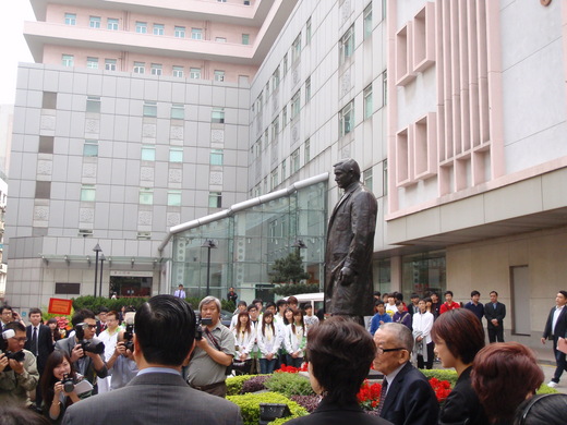 剛開始我還以為要搭車過去,不過我們偉大的組長-伍鳳兒跟我說要走路過去,讓我大吃一驚,在那北京城的酷暑以及寒風中走一天路的可怕情景立即浮現腦中,但沒想到的是,大家嘻嘻哈哈走了幾分鐘後就到醫院門口了,也讓我不禁讚嘆:「澳門真是小的好!」到了醫院的門口,矗立一尊孫中山先生的塑像,從髮線看上去,應該是他年輕時的樣子,跟我們在台灣學校裡常看到的那種莊嚴肅穆的塑像很不一樣,看起來也瀟灑許多,有一點型男的味道,不會有一種難以言喻的距離感。