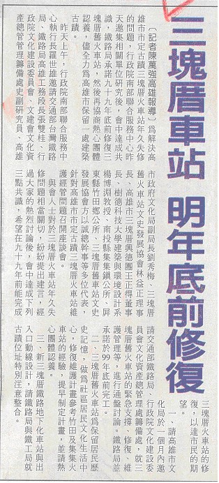 【涂建豐╱高雄報導】位於高雄市三德西街的三塊厝車站是全市僅存的木造車站,二○○四年定為市定古蹟,因年久失修,日漸腐朽,行政院南部聯合服務中心執行長羅世雄日前與相關單位協調,台鐵指今年有五百萬元預算,可進行修復研究計劃,高雄市文化局也將在農曆年後開會,希望今年完成研究計劃,明年底完成修復。
