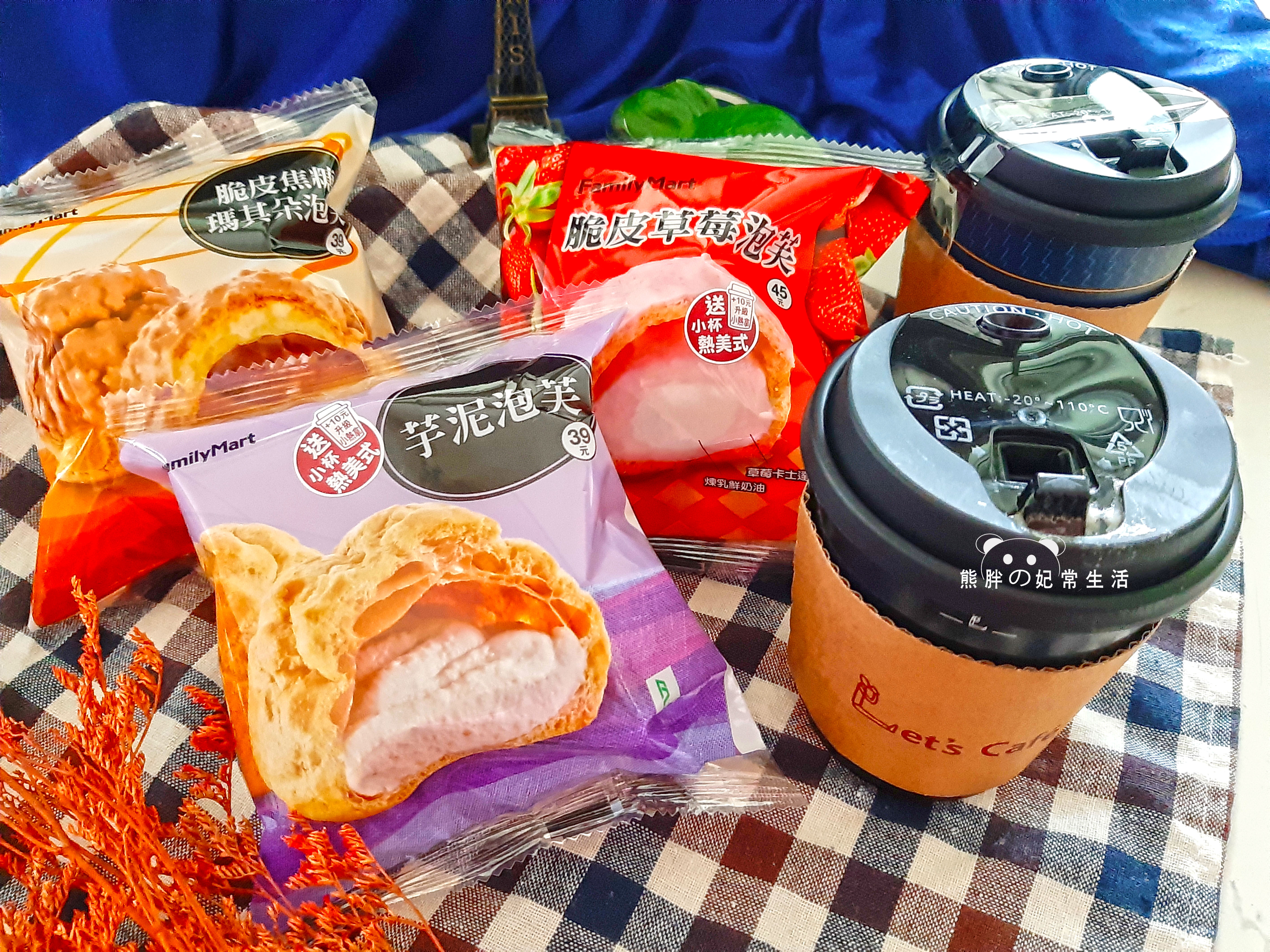 全家便利商店近期推出了三種不同口味的泡芙系列,熊胖今天一次購買了三種不同口味,焦糖瑪奇朵、芋泥,還有妃妃最愛的草莓口味,不過由於各家店的進貨數量似乎不一定,還是因為太熱銷某種口味已經賣完了也不知道,總之我們今天總共大約跑了三~四家才將口味一次購足。