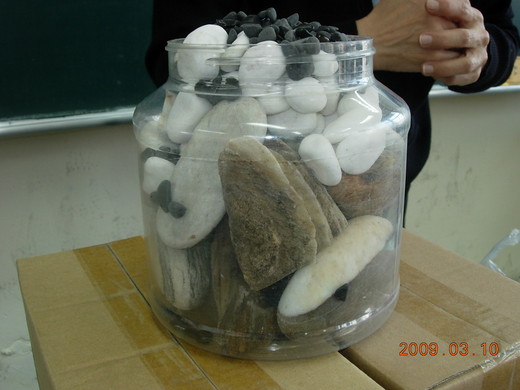 接著又裝入較小一點的石頭,罐子還是沒滿,底下還有很多空隙。