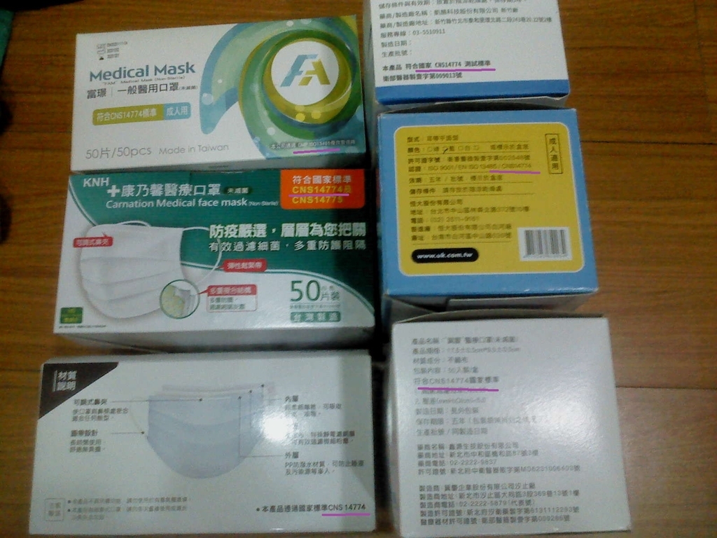 拿我手上有的口罩盒、口罩空盒來說,全部都只標示「CNS14774」,沒有一家有用使用「正字標記」,甚至感覺起來有些廠商似乎覺得,「CNS」 或是 「正字標記」 不會讓商品賣得更好,只是找到地方有標應付了事。
