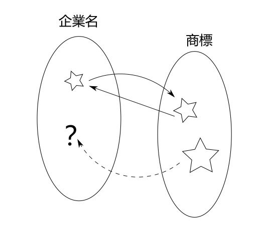 對數學、羅輯、程式設計比較有概念的讀者可能已經在剛才的小插曲中用數學式來表示問題,也就是「企業名字 = 商標」到底有沒有問題,又或是在什麼情況下才會出錯,更厲害的讀者可能已經進一步地劃出類似以下的集合一對一映射關係圖,